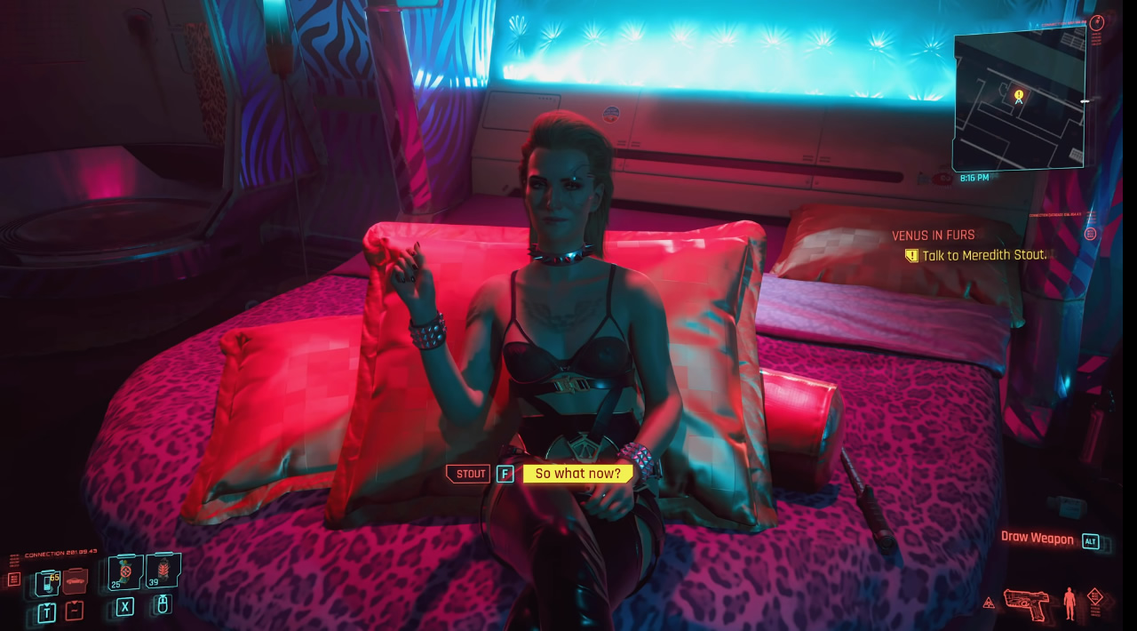 Later, she'll send you a text message. Respond positively, and you'll be invited to a hangout at the No-Tell Motel - but it's a one-time thing, strictly business only. One advantage of this encounter is you have an opportunity to pick up a unique, iconic blunt melee weapon from the room where you have your romantic encounter with Meredith Stout.