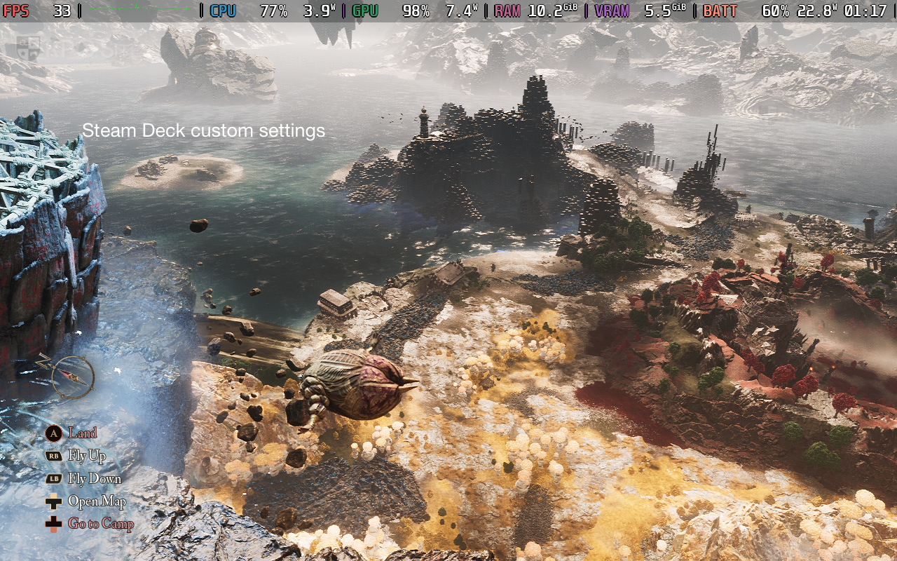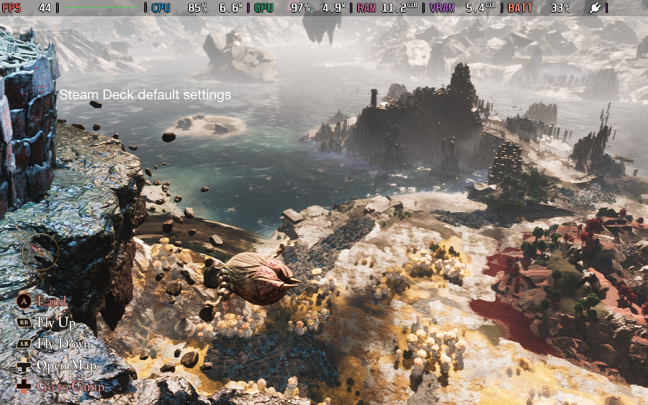 As for the refresh rate, I recommend 30fps at 90hz or you could continue playing it uncapped. I don't like an unstable experience during combat involving parrying so I prefer the 30fps experience on Steam Deck. Using my settings, flying around the world map might see dips below 30fps, but it never dropped below 28-29fps in the areas I tested, and it still looks a lot better than the default locked preset.
