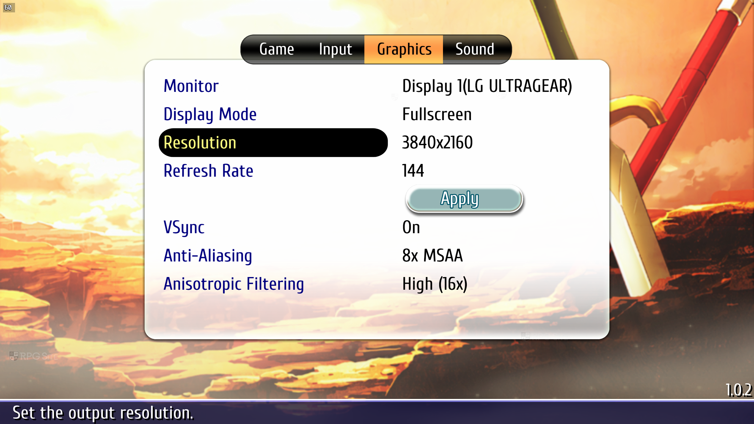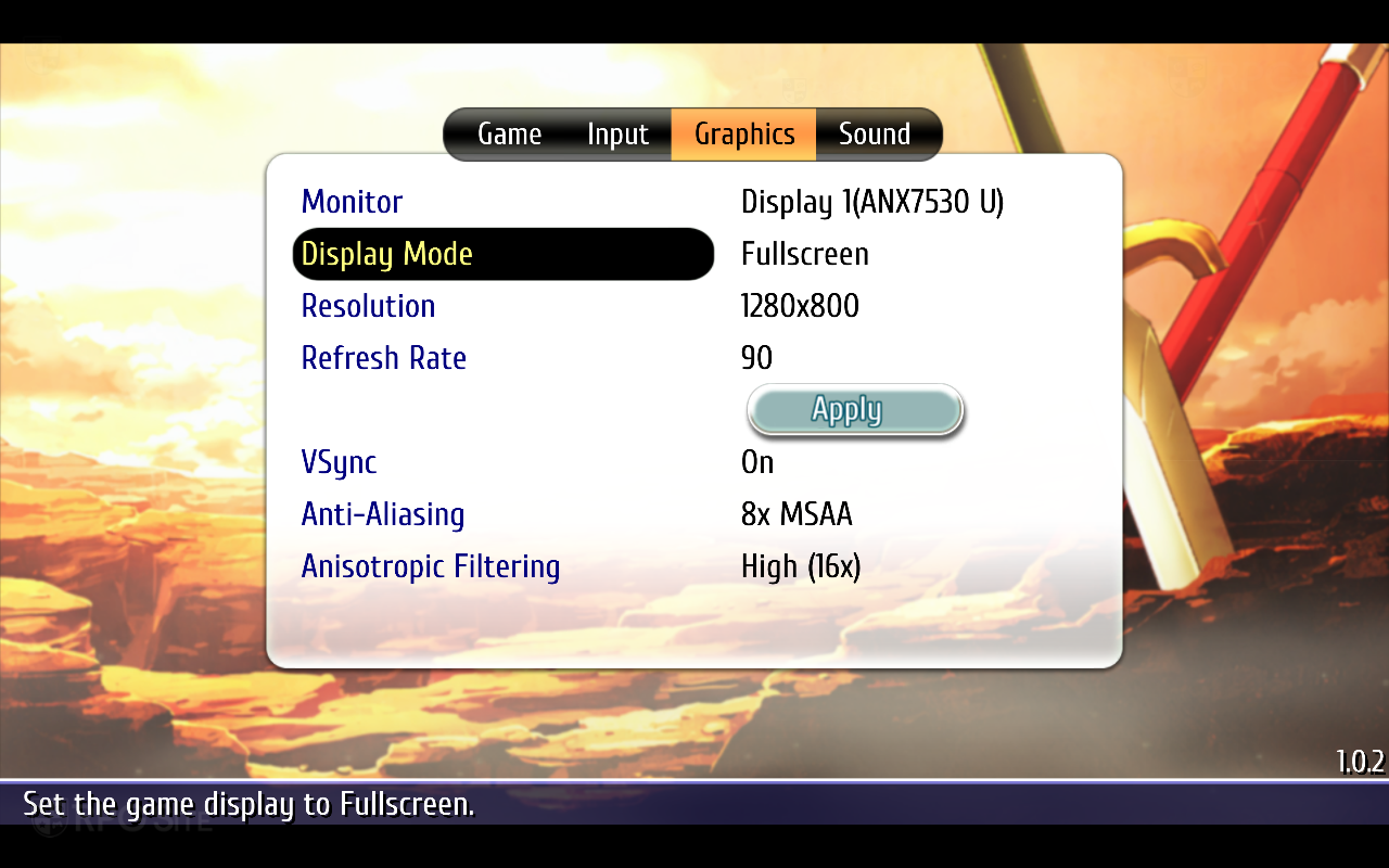 On the graphics side, Ys vs. Trails in the Sky: Alternative Saga lets you select monitor, adjust resolution (320 x 200 up to 4K with 21:9 and 16:10 support), select monitor refresh rate, toggle v-sync, adjust anti-aliasing (none, FXAA, 2x MSAA, 4x MSAA, 8x MSAA), and adjust anisotropic filtering (off, 4x, and 16x). As for ultrawide support, while the gameplay renders properly at 21:9 with the UI taking into account the wider screen real estate (including in story mode), the game's menus are still rendered at 16:9 with black bars on each side. I didn't expect this to change given how a lot of the game uses 2D assets that were designed for 16:9 screens, but it is worth noting. I've included some 21:9 screenshots below.