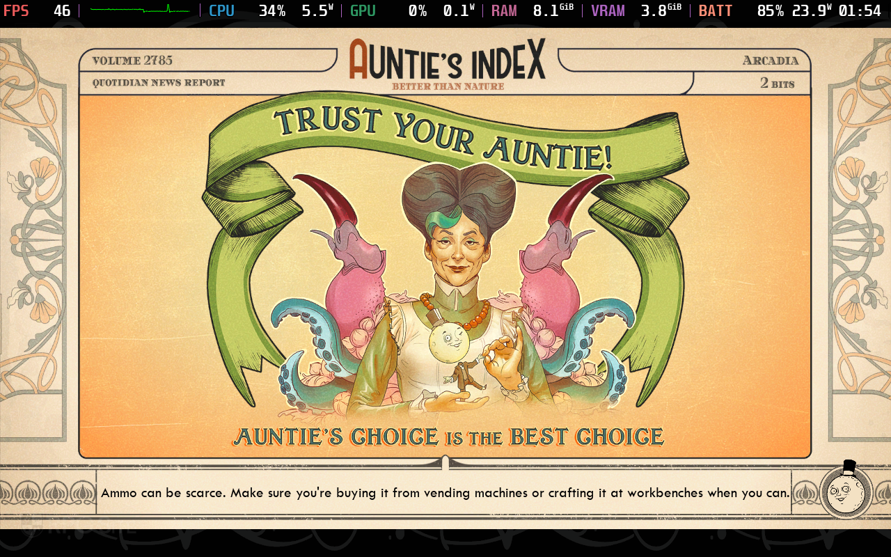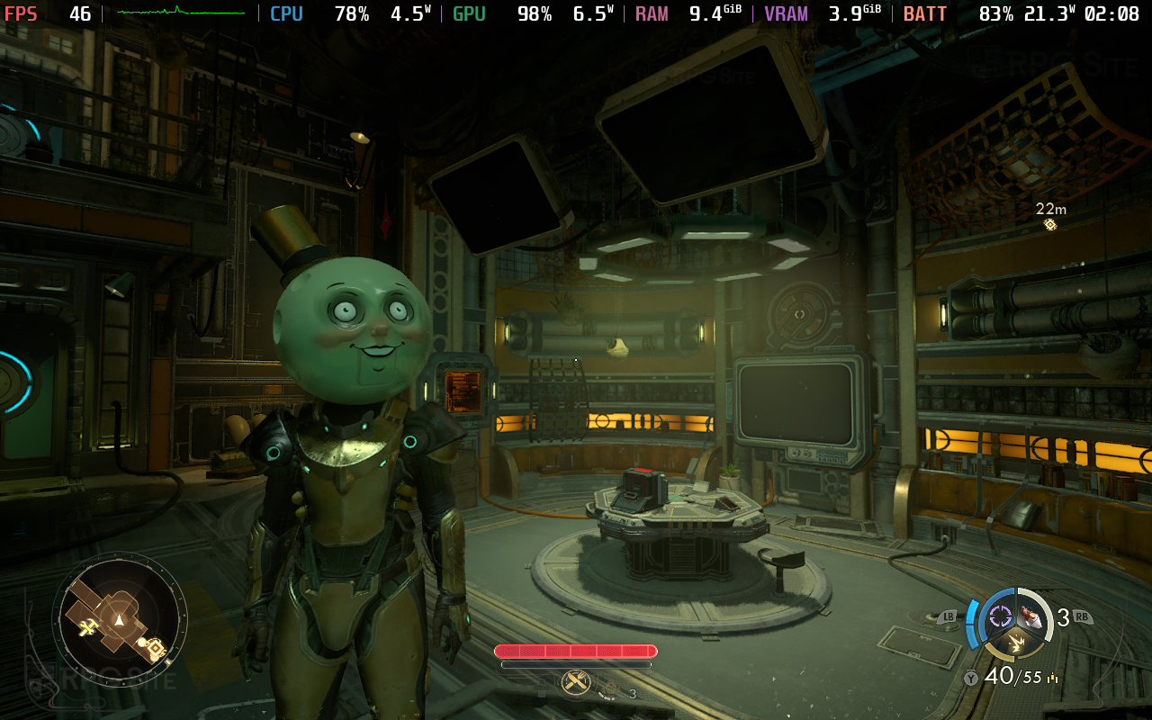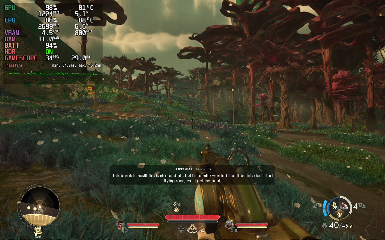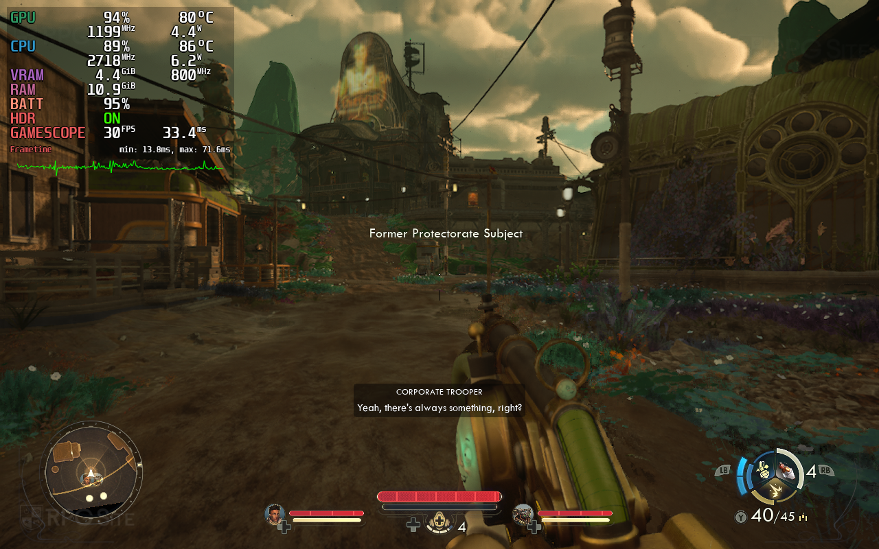 The open area of Paradise Island, even initially in the town, is quite a bit heavier with many NPCs and buildings. This is where performance falls apart and I had to use more upscaling with a lower internal resolution. Given the team will be optimizing The Outer Worlds 2 for handhelds, I would say this is a solid base to work with, but I have a few recommendations to make the Steam Deck experience of playing The Outer Worlds 2 better if you want to play it right now. I specifically retested the open world once again while sprinting as you can see in the gallery below towards the end.