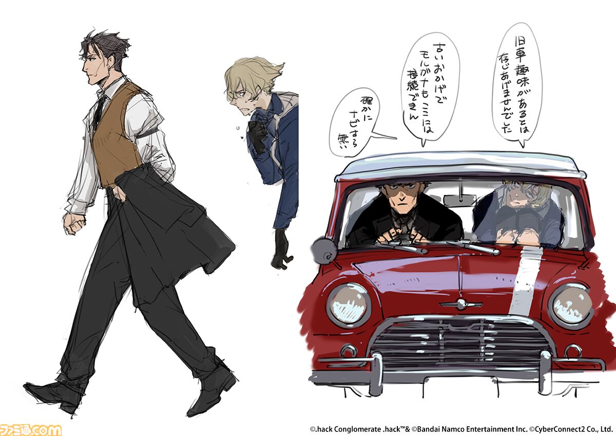 One thing about .hack//Z.E.R.O. that’s really caught my eye, in this regard, is a concept art piece in the Famitsu interview showing two characters involved in what’s presumably the real-world aspect of the upcoming game. There is a dialogue exchange between them inside an antique car – a model that is clearly incongruent with the time period being represented. A character mentions they didn’t know the other gentlemen had a fondness for classic cars, and the response was thanks to its age as an older model, not even Morganna can interfere there.