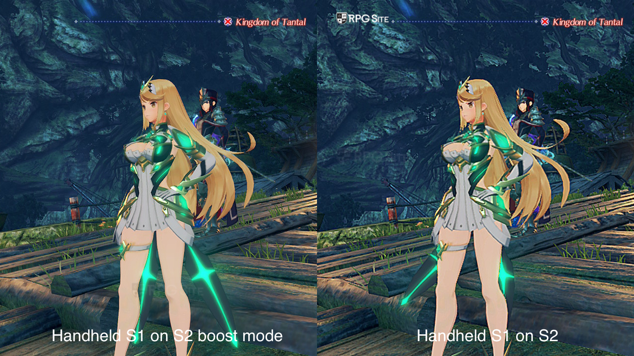 Xenoblade Chronicles 2 is notorious for how it looked handheld and with boost enabled, you see improvements right from the title screen. While it obviously doesn't look as clean as newer Xenoblade games, boost mode helps a ton with post-processing making characters look less oversharpened as you can see with Mythra in the image below. The UI in Xenoblade 2 is also now properly 1080p when playing handheld. Torna also benefits from boost mode, though it already improved on what Xenoblade Chronicles 2 did visually.