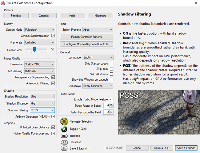 The option that seems most taxing is the PCSS option for shadow filtering, and as explained in the config menu, this will affect the softness of shadows depending on the distance from the shadow's caster. The two images above show a comparison between Shadow Filtering set to PCSS and High (the next option down), where you can clearly see how it affects the appearance of shadows at Rean's feet.