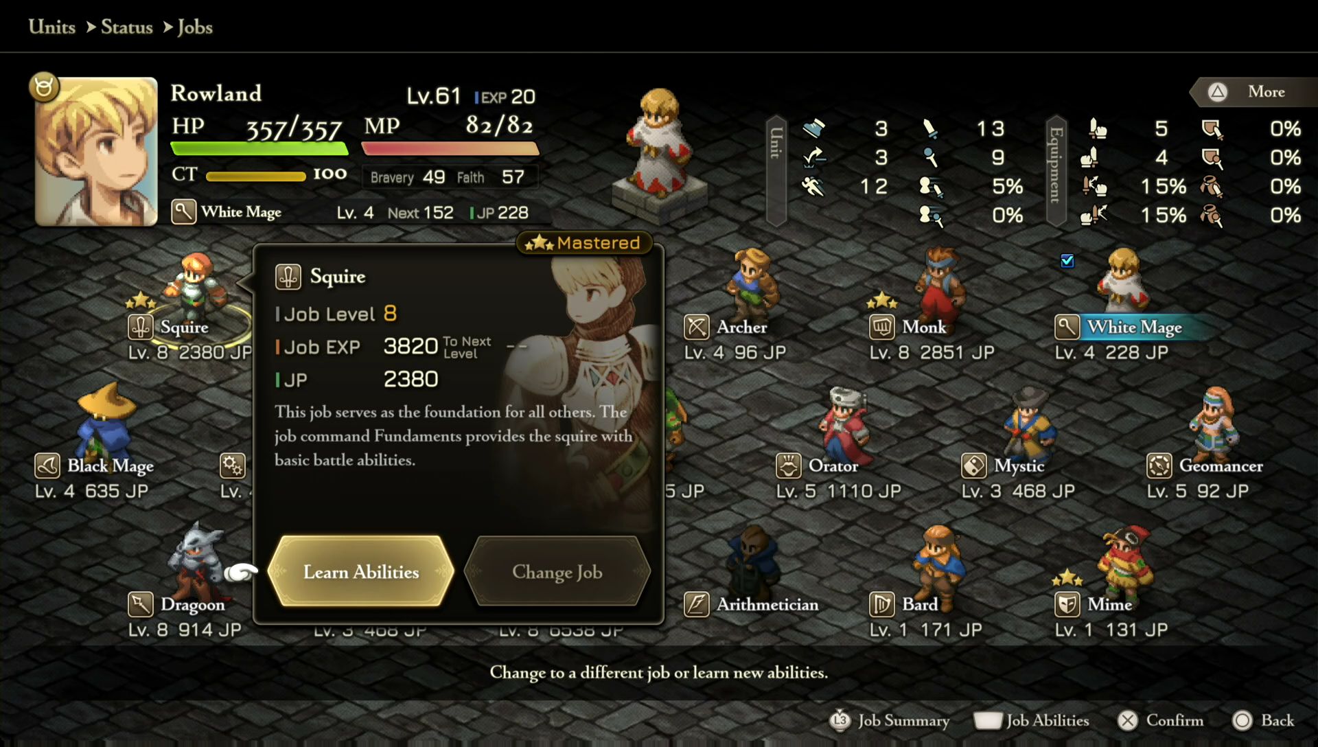 The Squire is the basis for all of the physical damage units, and its "Focus" action should be learned right away as it is the perfect way to JP grind!