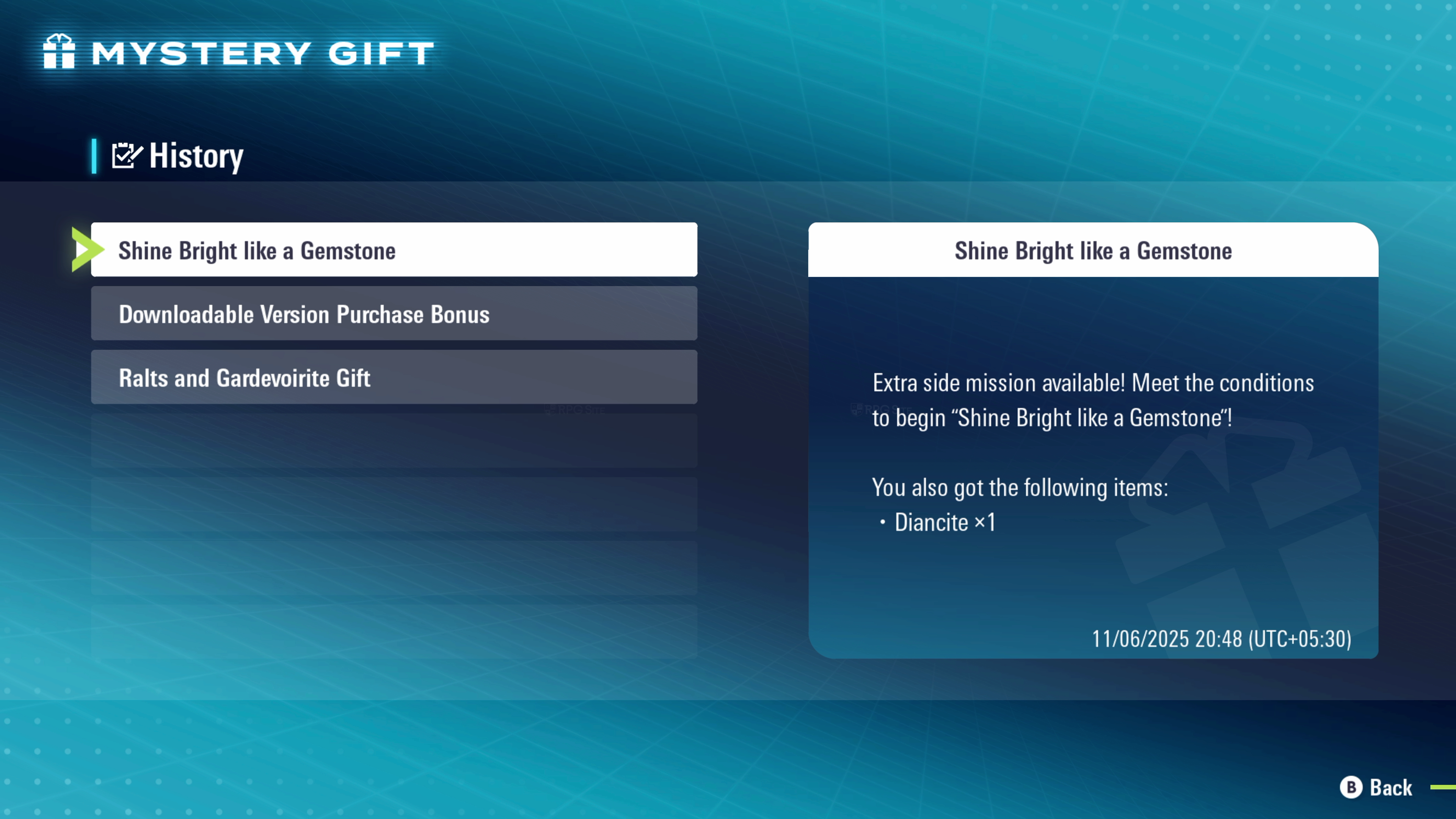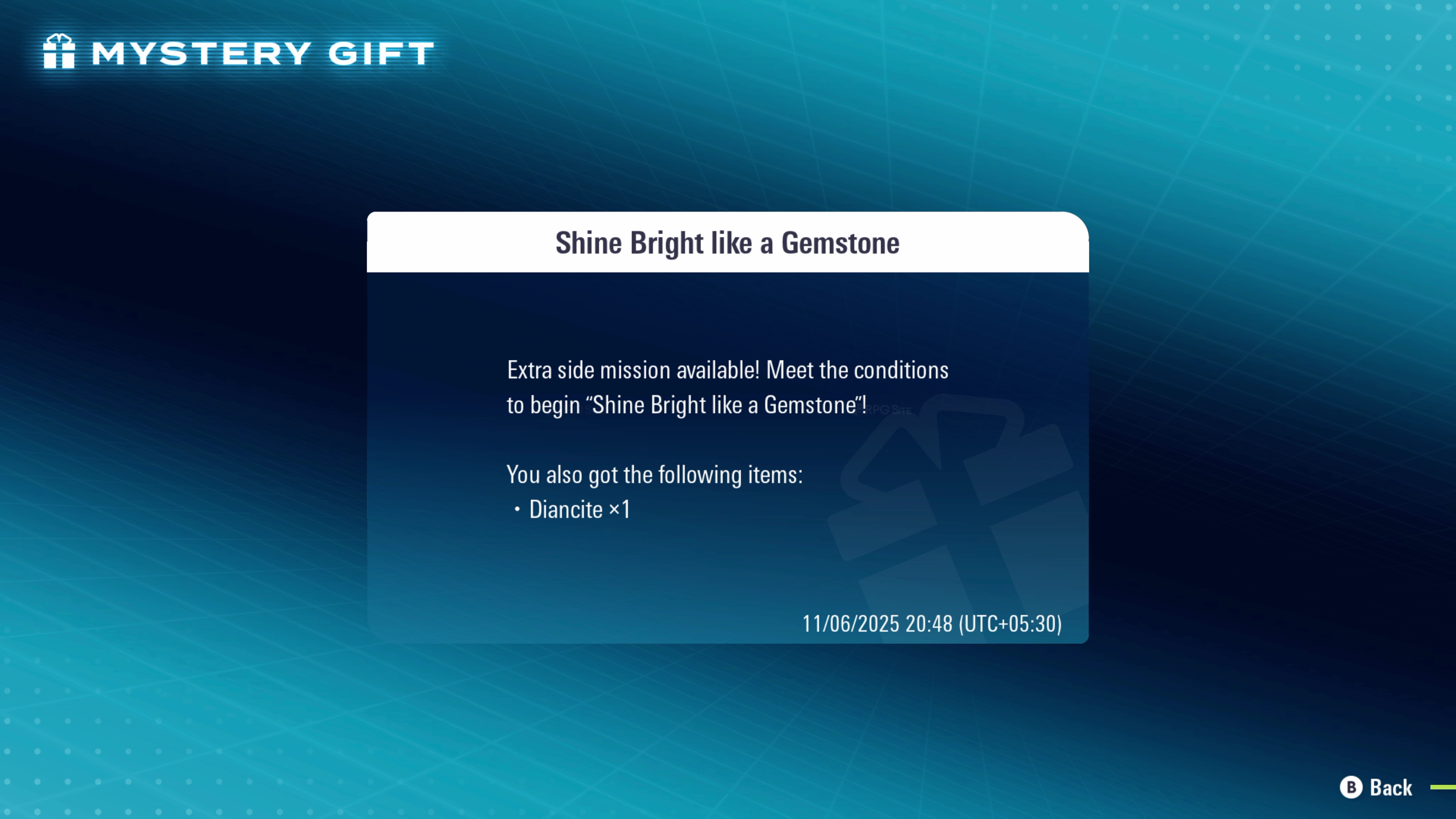 Beginning November 6 you can claim a Diancite in the Pokemon Legends: Z-A base game using the Mystery Gift "Get via Internet" feature. The Diancite stone unlocks an opportunity to encounter and catch the Jewel Pokémon Diancie through an extra side mission titled “Shine Bright like a Gemstone.”