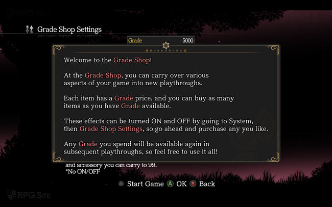 The Grade Shop originally let you carry over various aspects of your game into new playthroughs. Each option or item in the Grade Shop in Tales of Xillia Remastered has its own Grade Price and you have a fixed amount of Grade available. If you use all your Grade in one playthrough, you can use it again on the next one as well so there's no harm in spending it all now. You can also toggle off most options here.