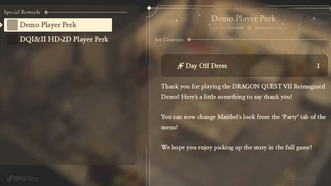 If you have played (you don't need to finish the demo) and have save data for the Dragon Quest VII Reimagined demo on your system (or cloud for Steam), you will unlock Maribel's Day Off Dress for use in Dragon Quest VII Reimagined. You can find it below: