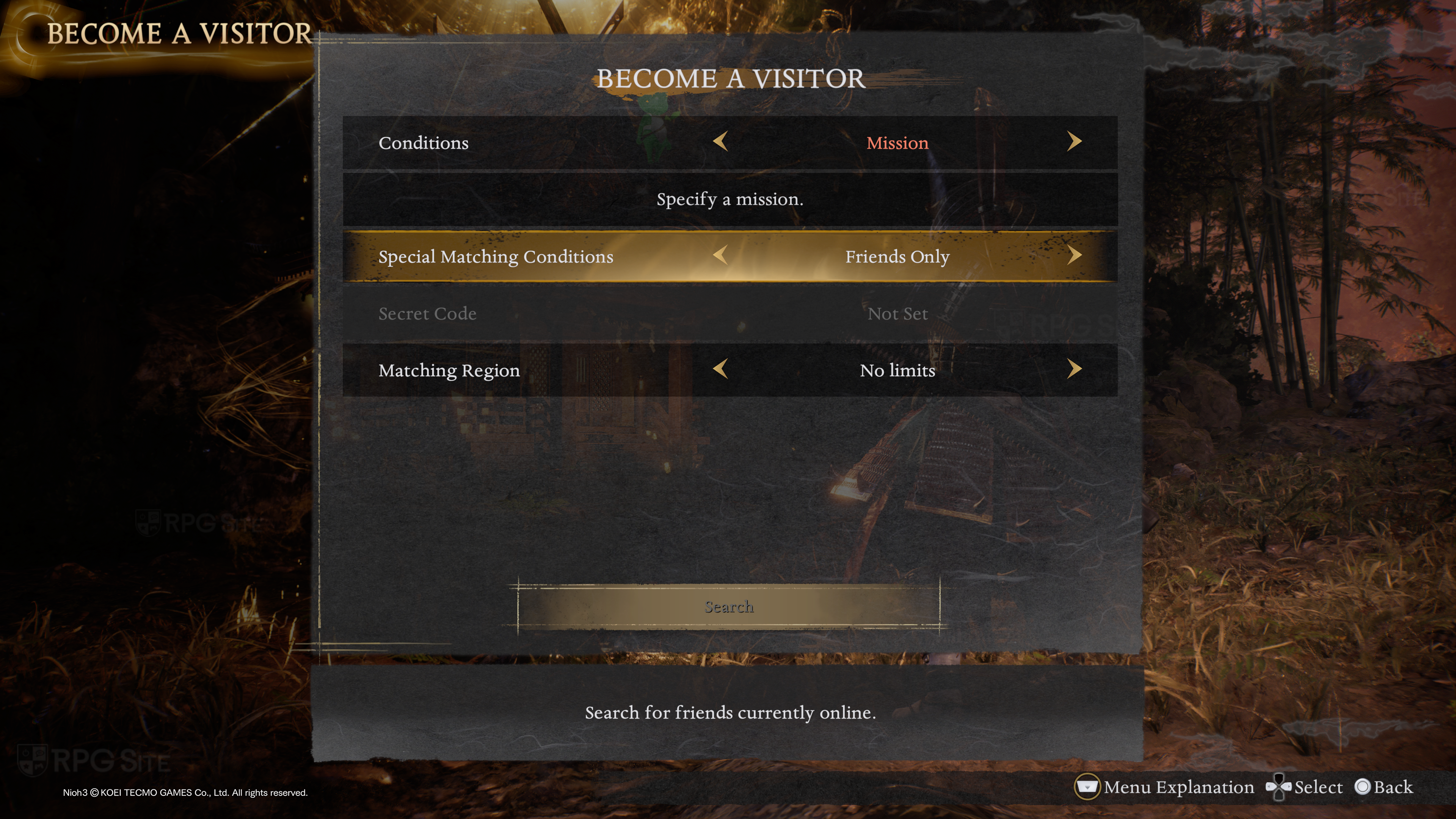 When you opt to Become a Visitor, you can set conditions like a specific mission (and select the mission you want to help on), then enable matching conditions (none, secret code which is password, or have it filter to just friends only). The final option is matching region which lets you get matched with players in nearby regions, the same region, or with no limits.