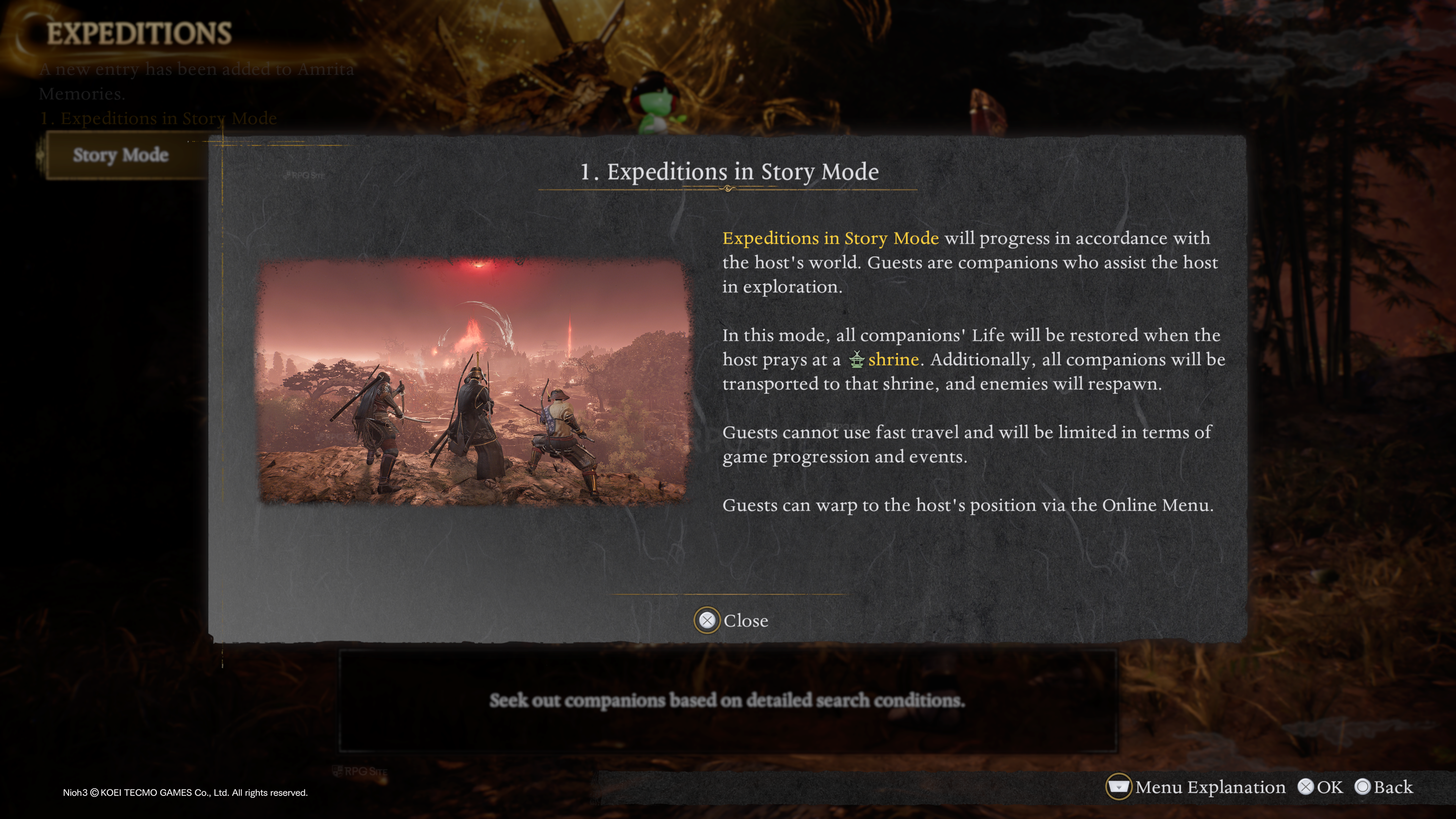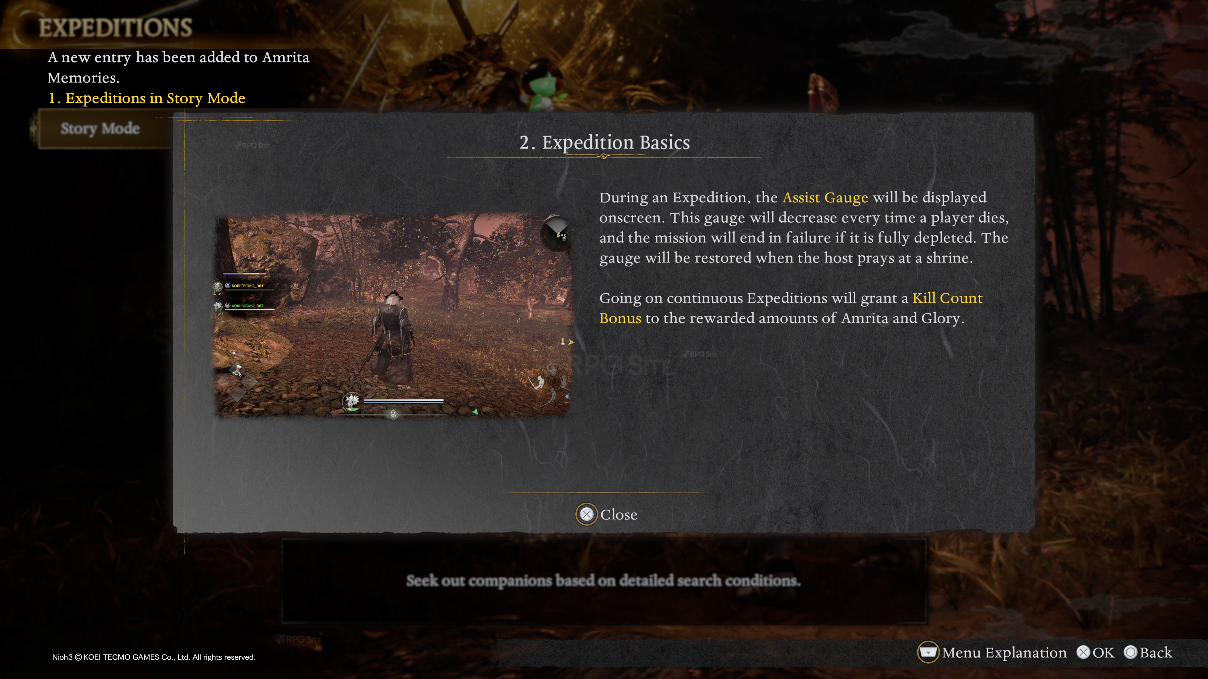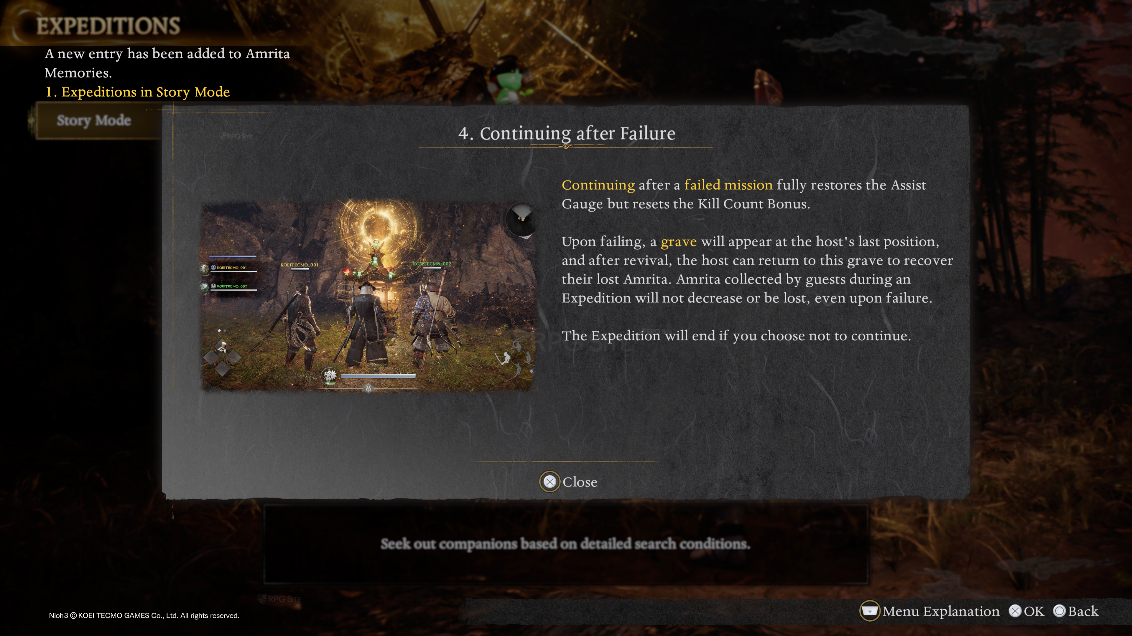 - Expeditions: Expeditions let you progress the story with other players. Expeditions in Story Mode features progress in accordance with the host's world. Those who join are treated as Guests who are companions to the host to help with exploration. All companions' life will be restored when a host prays at a Shrine, and all companions are also transported to said Shrine when a host prays there. Enemies respawn when this happens. An online menu lets you warp to the host's position as well. Expeditions feature an "Assist Gauge" on the left of the screen. This decreases whenever someone dies and the mission will be marked as failed if the gauge is fully depleted. This gauge is filled up and restored when a host prays at a shrine. Doing multiple expeditions in a row give you a Kill Count Bonus to the amount of Amrita and Glory you earn. If a player dies during an expedition, a grave appears (golden) and you can revive players by holding R1. This restores the Assist Gauge. You can also restore yourself by holding down O if the gauge is not empty. If the mission has failed, you can still continue with a reset Assist Gauge, but the Kill Count Bonus is reset. The host can also recover lost Amrita by going to the grave where the host was last before the mission was failed. If you do not continue, the Expedition will end here.