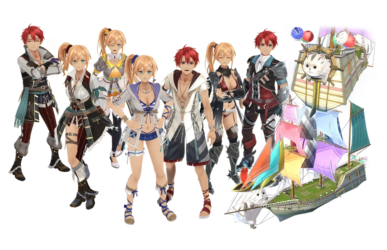 - Bonus Set 1: Costumes - A set of costumes and attachments for the main characters. This includes the following: Pikkard Suit (Adol), Pikkard Suit (Karja), Pickaback Pikkard x2, Legendary Cleria ARmor, Azure Mermaid, Summer Adventure, Endless Voyage, Heroic Captain.