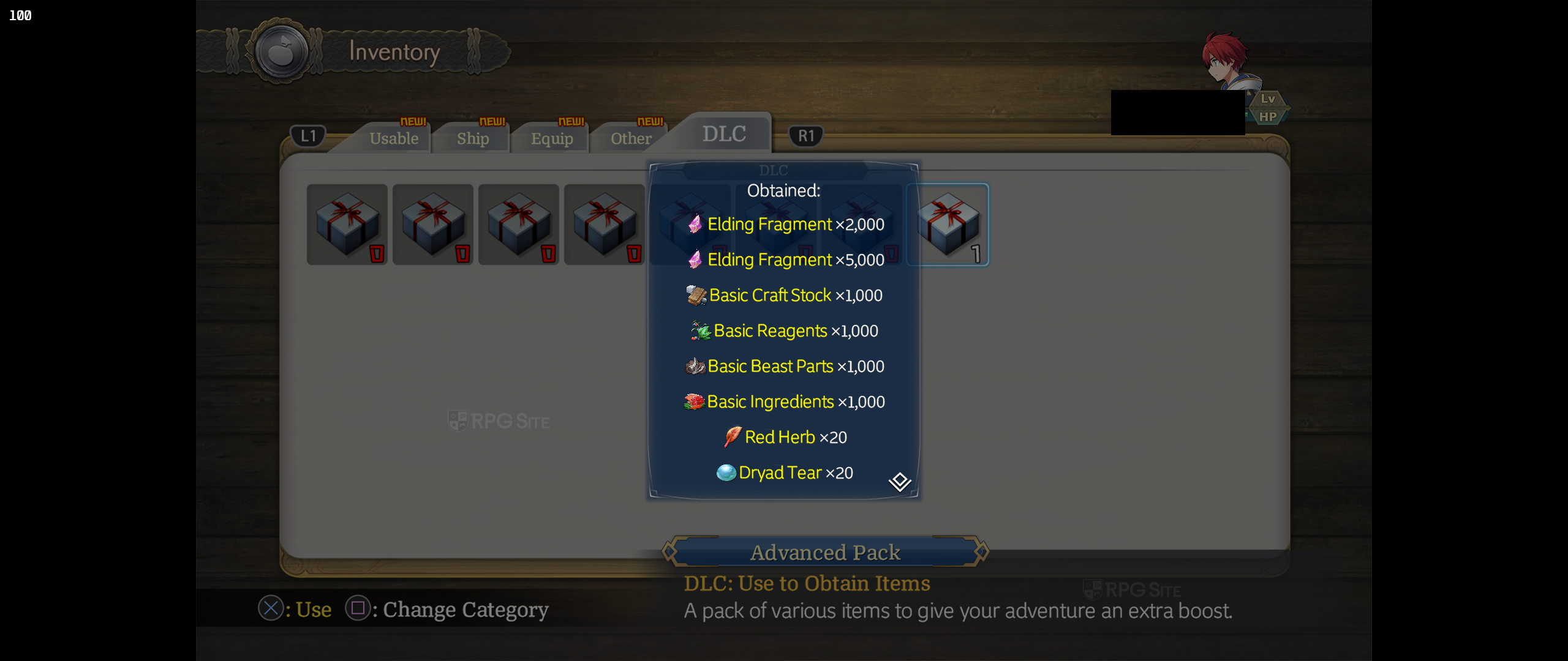 - Advanced Pack: A pack of various items to give your adventure an extra boost. This includes the following: Strength Elixir x3, Break Elixir x3, Defense Elixir x3, Vitality Elixir x3, Luck Elixir x3, Ascetic's Arcanum x5, Crystal Shards x100000, Sparkling Whitesand x600Elding Fragment x2000, Elding Fragment x 5000, Basic Craft Stock x1000, Basic Reagents x1000, Basic Beast Parts x1000, Basic Ingredients x1000, Red Herb x20, Dryad Tear x20, Schneeblauchen x20, Silver Cheese x20, Golden Potato x20, Aurora Berries x20, Ultimate Beast Meat x20, Supreme Fish Meat x20, Red Drop x40, Blue Drop x40, Yellow Drop x40, Dark Drop x40, Rainbow Drop x20, Red Lump x30, Blue Lump x30, Yellow Lump x30, Dark Lump x30, Rainbow Lump x15, Red Seastone x15, Blue Seastone x15, Yellow Seastone x15, Dark Seastone x15, Rainbow Seastone x7, Sword Soul+ x2, Axe Soul+ x2, Shield Soul+ x2, Armor Soul+ x2, Chalice Soul+ x2, Lyre Soul+ x2, Limitless Courage+ x2, Sin Seal+ x4, Punishment Seal+ x4, Sin Star+ x4, Punishment Star+ x4, Sin Soul+ x4, Punishment Soul+ x4, Sword Soul EX x2, Axe Soul EX x2, Shield Soul EX x2, Armor Soul EX x2, Chalice Soul EX x2, Lyre Soul EX x2, Almighty Dawning x2, Dominative Dawning x2, Unbreakable Dawning x2, Providential Dawning x2, and Egoless Dawning x2.