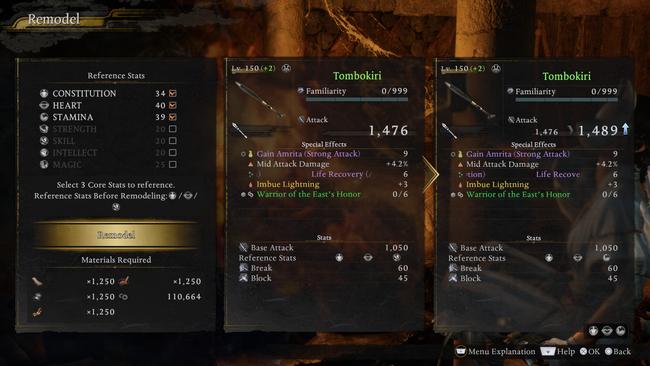 The Remodel menu will offer different upgrades based on whether you're highlighting a weapon or armor. When you're going to remodel a weapon, it will let you re-assign core stats that serve as references to determine the weapon's stat, as each weapon has 3 referenced stats by default. It goes without saying that you will want to assign those to the top 3 stats you have invested in the most.