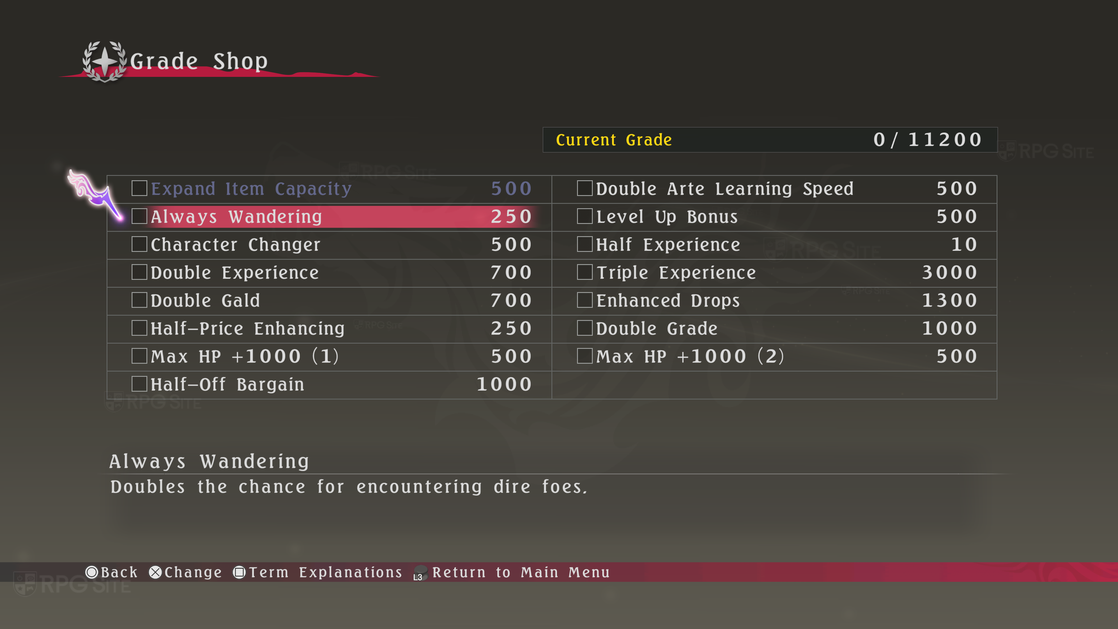 • Always Wandering - 250 - Doubles the chance for encountering dire foes.