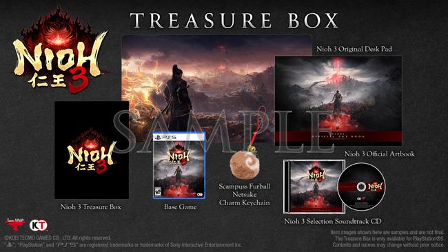 The PS5 Treasure Box for Nioh 3 is priced at $126.99 and includes the base game, a Scampuss Furball Nesuke Charm keychain, an original desk pad, an official artbook, a Nioh 3 Selection Soundtrack CD, and a special collector's box. This is available in addition to the regular Nioh 3 physical release and the SteelBook Edition which is priced at $69.99 (the same price as the base game).