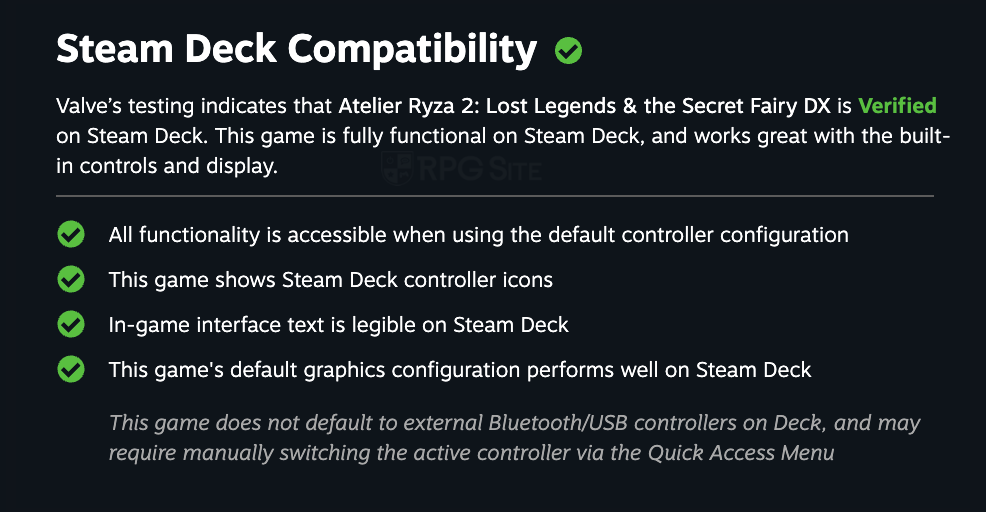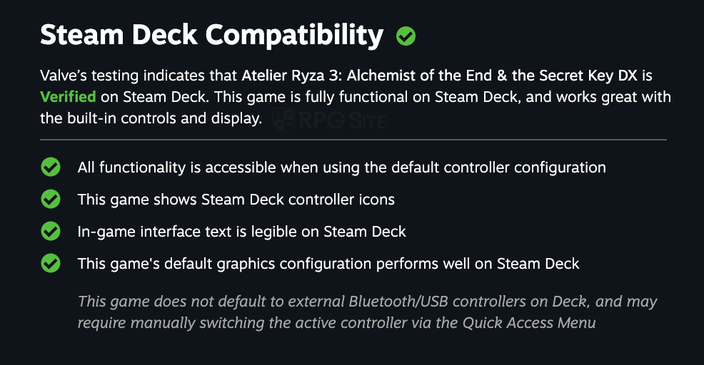 This makes the complete Atelier Ryza Secret Trilogy Deluxe Pack Steam Deck Verified. Valve does note that the three games do not default to external Bluetooth/USB controllers and may require users to manually reorder controllers when playing docked or using an external controller in tabletop mode. You can find the three ratings from Valve below or on the individual game pages: