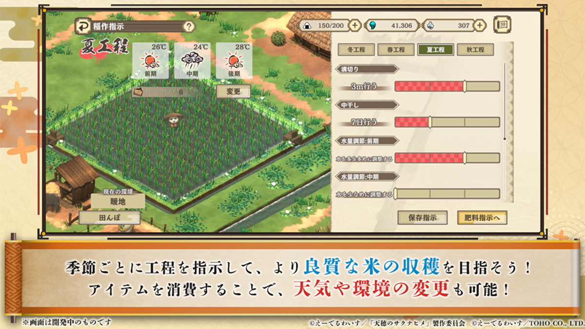 Rice crops will also form a key gameplay element in this title. After planting the crops, players will be able to make more detailed farming adjustments that will determine the harvests' quality when they are available 6 hours later. They can even use specific items to alter the weather and environment to improve the harvests even further. The harvested rice can then be equipped to a character to improve their stats.