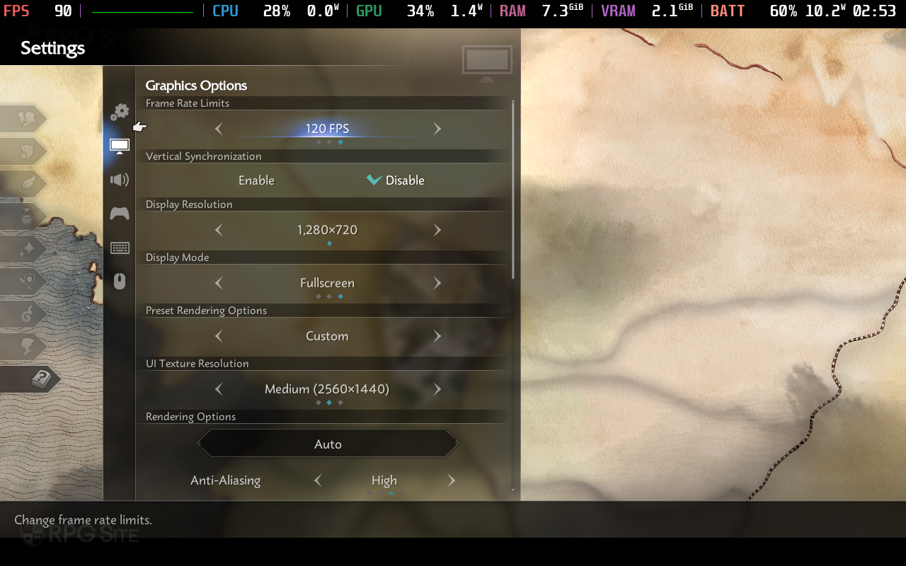 Based on the opening hours, if you want to play at 60fps on Steam Deck with crisp visuals, you don't need to change anything, but you should cap the screen to 60hz if you play on a Steam Deck OLED. If you want to aim for 90fps, you cannot play with the high preset since it drops to the low 80s and high 70s at times in particle-heavy locations. During combat, I never saw the game dip below 60fps even on the high preset, but getting a locked 90fps doesn't seem viable right now without dropping to the medium preset or lower in some locations. I'll spend more time looking into this for my full recommended settings around launch, but I ended up sticking to a 60fps target on Steam Deck OLED for now.
