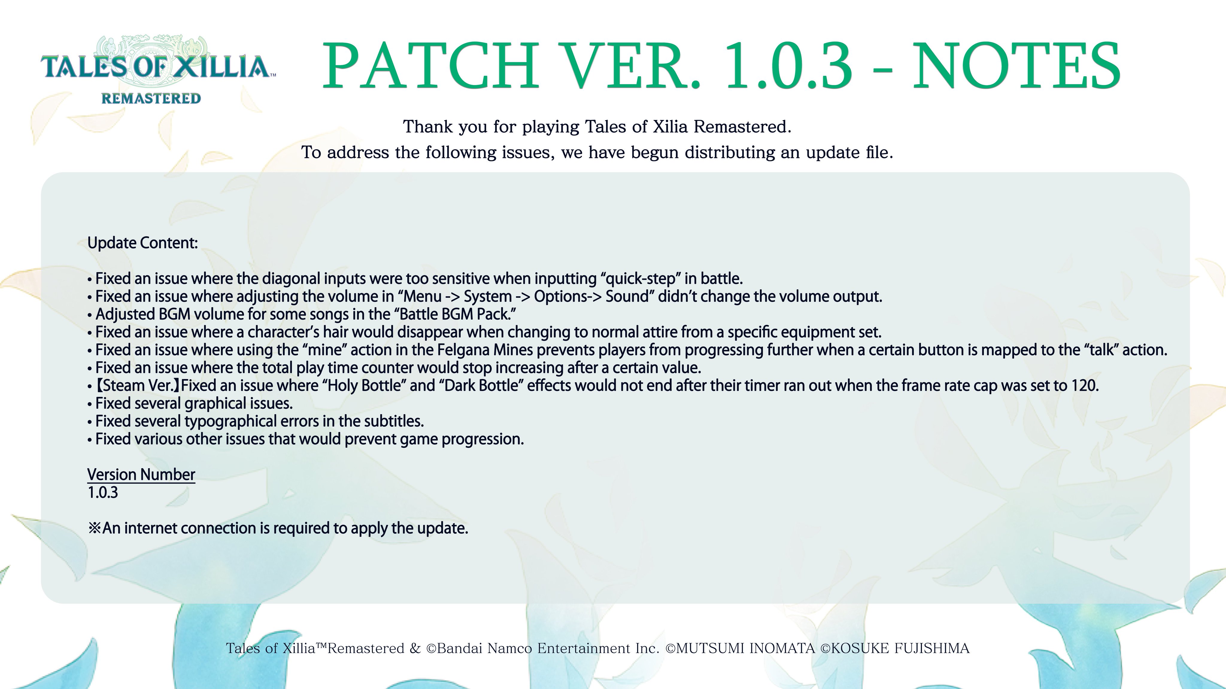 Tales of Xillia Remastered version 1.0.3 update patch notes