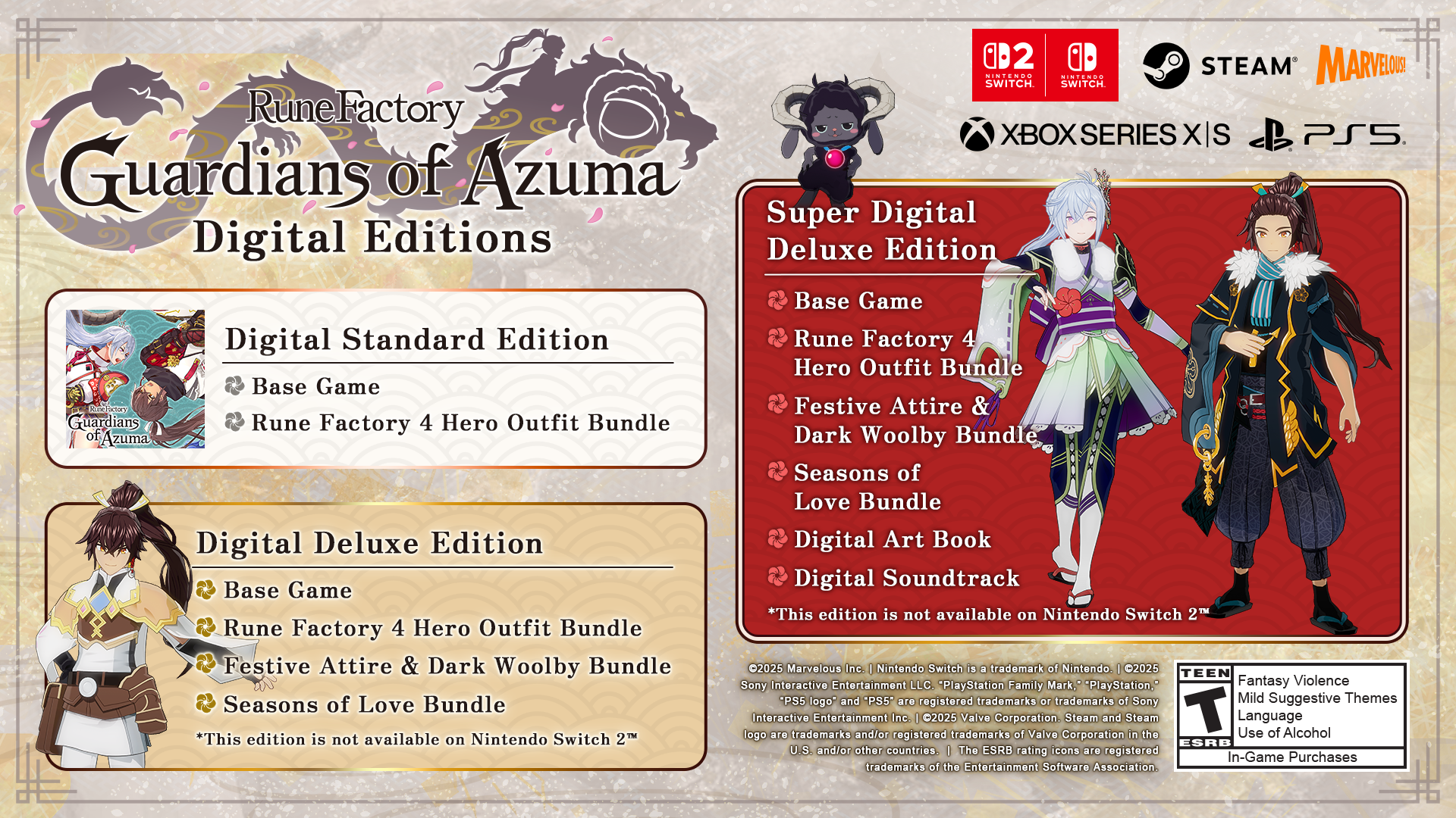 Marvelous USA today announced that the Action RPG/Life-Sim title Rune Factory: Guardians of Azuma will be releasing for PlayStation®5 and Xbox Series X|S systems on Feb. 13, 2026, with all free post-launch update content previously provided to the Nintendo Switch™, Nintendo Switch™ 2, and PC versions of the game also included in the base game for PlayStation and Xbox versions. Digital editions for PS5 and Xbox Series X|S will include a standard edition, available for $59.99; a Digital Deluxe edition, which includes the game, the “Seasons of Love Bundle,” and the “Festive Attire and Dark Woolby Bundle” for $69,99; and a Super Digital Deluxe edition, which includes the game, the “Seasons of Love Bundle,” the “Festive Attire and Dark Woolby Bundle,” a digital soundtrack, and a digital art book, for $79.99. All digital versions of the game will also come with the “Rune Factory 4 Hero Outfit Bundle” as a special bonus. Previously available downloadable content will also be available on PS5 and Xbox Series X|S at launch, including the “STORY OF SEASONS Bundle” and “Sakuna DLC.”