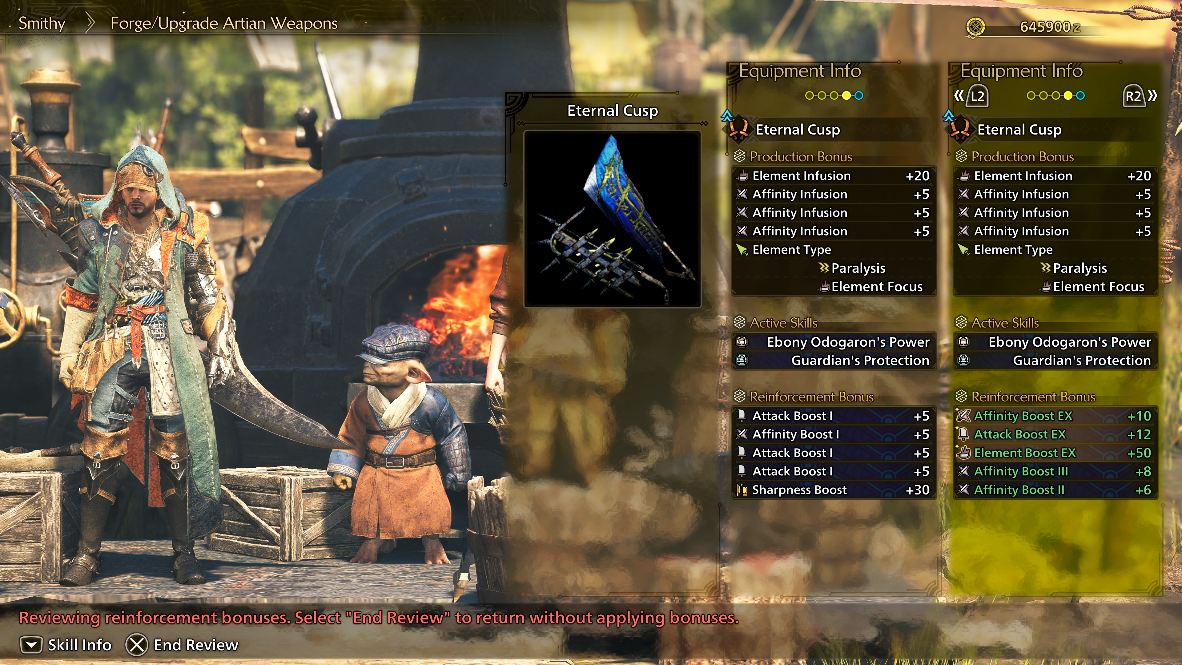 Slumbering beneath the great forge of Azuz, the awakening of the titanic Gogmazios threatens widespread destruction for the inhabitants of the Forbidden Lands. To tackle a monster of this scale, groups of up to four Hunters and four Support Hunters are being tasked to form parties of eight capable of slaying this fearsome foe. The permanent Event Quest for Gogmazios can be repeated to acquire materials which can be used to upgrade rarity 8 Artian Weapons into Gogma Artian Weapons. Bonuses from the original Artian Weapon will be carried over to the Gogma Artian Weapon, and one random Set Bonus Skill and one random Group Skill will be granted. The Gogma Reinforce feature allows Hunters to keep or reset the bonuses to activate even more powerful bonuses and re-roll the Set Bonus Skill and Group Skill by using special material. Hunters with Hunter Rank 100 or above will also gain the “Transcendence” ability at the forge to increase the maximum level of their high rank armour and even enhance the decoration slots for rarity 5 and 6 pieces.