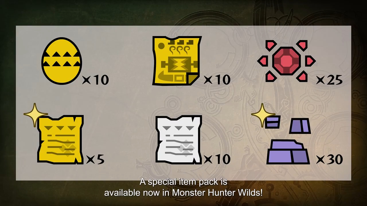 The message also reveals a celebeation item pack for Monster Hunter Wilds available now with Golden Eggs, Silver Talisman Tickets, and more as shown below: