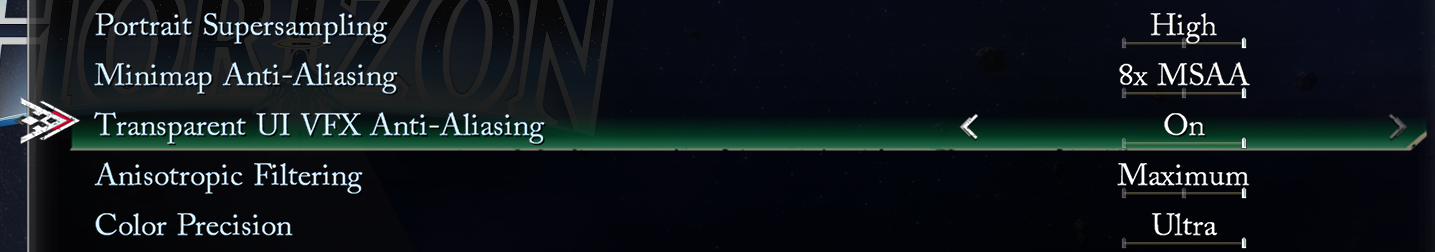 One of these is quite simple: in addition to plenty of in-game anti-aliasing modes, we also already featured a minimap anti-aliasing setting (that I'm still very proud of and wish was adopted more widely), and a portrait supersampling setting. However, there is one particular rendering pass that escaped all existing anti-aliasing methods. The details are a bit complicated, but the result is that in addition to main game render scale, main game anti-aliasing, portrait supersampling, and minimap anti-aliasing there is now also a "Transparent UI VFX Anti-Aliasing" option. This graphics debugger screenshot shows an example of the elements that are affected by this setting highlighted in red: