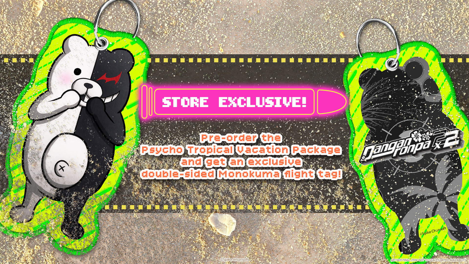 A flight tag that doubles as a keychain. Exclusive to those who pre-order the Psycho Tropical Vacation Package limited edition from the Spike Chunsoft Official Store. *Design for illustrative purposes. Visit the official Spike Chunsoft Official Store for more details.