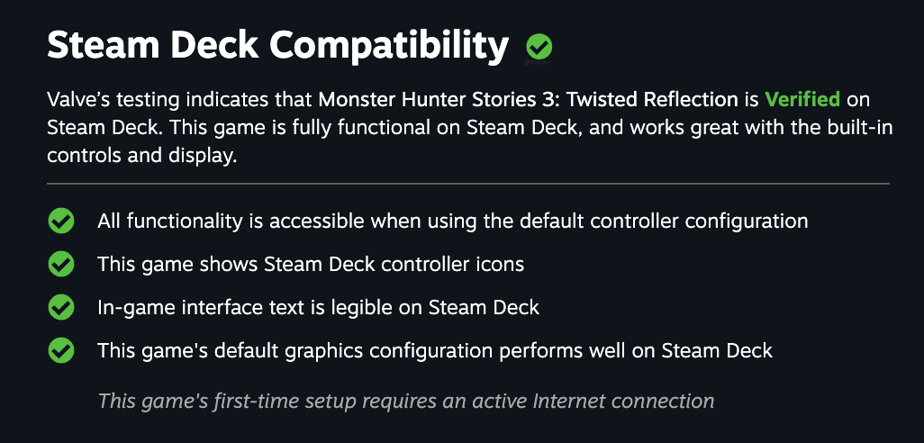 The rating from Valve happened a few hours ago and it notes that the first-time setup for Monster Hunter Stories 3 will require an active internet connection. This is likely because of the DRM. The rating isn't surprising considering how it already plays on Steam Deck. You can find Valve's rating for it below: