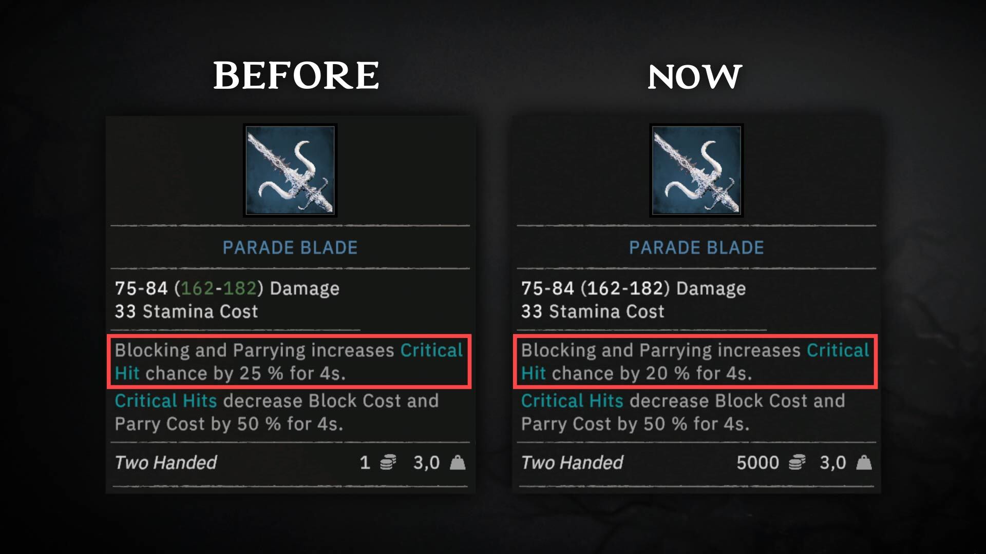 Parade Blade – Blocking and Parrying increases Critical Hit chance by 25% for 4s>20%