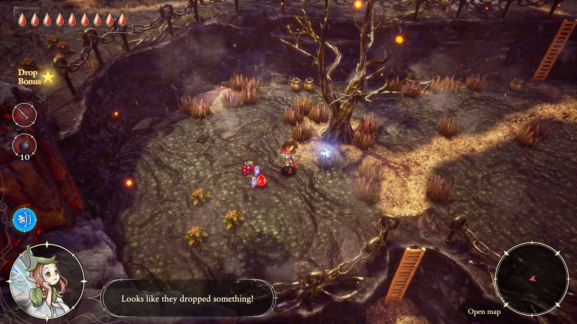 The defalling charm protects Elliot from damage taken when falling into pits and lava—welcome insurance to have when navigating narrow footing and floating platforms.
