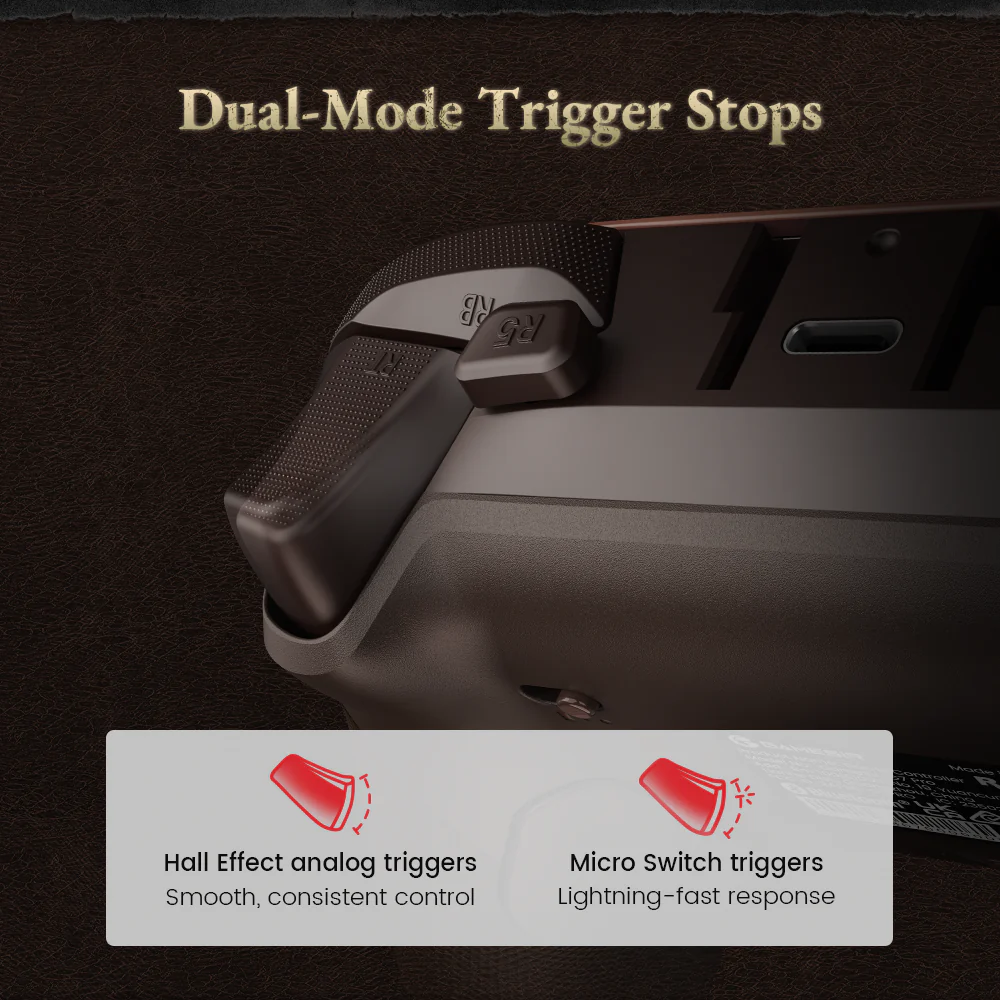 In addition to the TMR sticks, the controller features dual-mode trigger stops for instant switching between precision control and rapid-fire response. The Hall Effect analog triggers ensure ultra-smooth, linear input, while the micro switch triggers deliver lightning-fast actuation for a true competitive advantage.