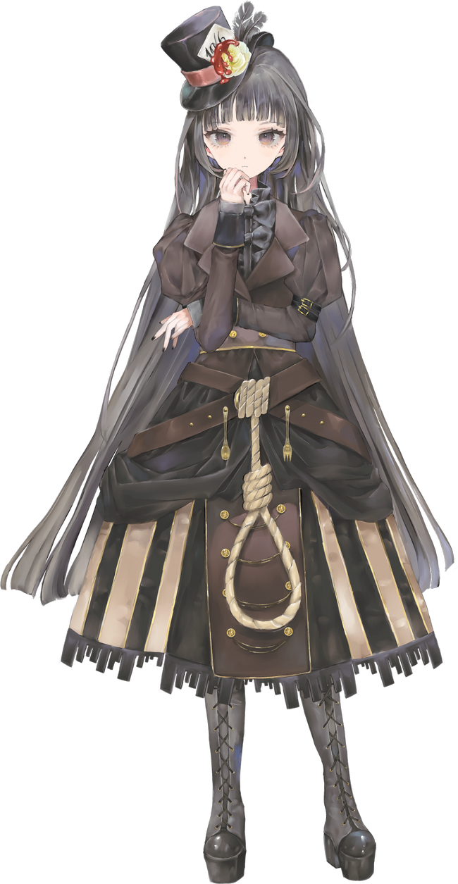 An amnesiac girl summoned to Wonderland. One of the participants of the Death Game held in Wonderland. She has lost all her memories from before and after her death. She throws herself into battle to reach the place she longs for. She shows no interest in anyone else and never displays affection toward others—except for Mary, perhaps... Is her memory loss a blessing? Or a curse?