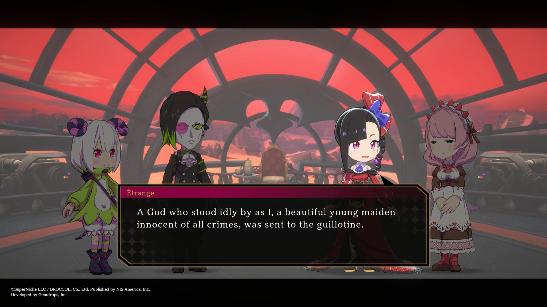 You play as Etrange von Ronsenburg, and the game quite literally opens with her execution after she was falsely accused of assassinating the king & queen. Sent to hell for a crime she didn't commit, the aloof Etrange becomes determined to live a "happy life" in the underworld, and she begins defeating the resident hierarchy of demons. Although she's not set on a revenge quest, her wish to live a happy life inadvertently puts Etrange at odds with the rulers of hell, and ultimately, even heaven. The overarching theme of this story is living life the way you want and not letting other people, organizations, or even religions define who you are.