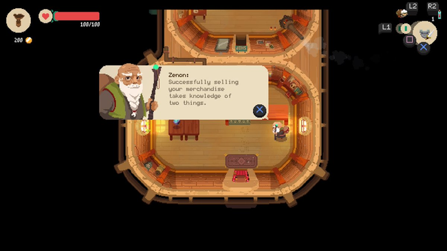 You play as Will, the owner of shop 'Moonlighter', which was left to him by his grandfather. The game opens with a series of easy to understand and simple tutorials that explain the combat mechanics of the game, which are also etched on the wall of the first dungeon you discover. Immediately after the start of the game, you are met with the first and only recurring NPC of any story significance. Zenon, the village elder, warns you about the dangers of the dungeons while giving little information on where they come from outside of a short exposition. Instead, he encourages Will to build his shop, suggesting that expanding Moonlighter and investing in other businesses might attract more people to the almost empty town of Rynoka.